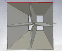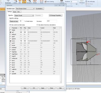 optimizer window CAD modelTaking this starting point, I experimented with different horn lengths, widths, and ridge flare parameters until the specification could be met while still mounting the antenna in its intended host vehicle. The final design was quite novel and only slightly resembled the example shown. Sometimes, lack of familiarity with established principles allows one to approach a problem with an open mind, and so arrive at an unusual solution.