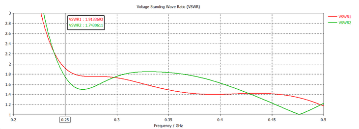 Following this electrical design exercise, I was asked to produce mechanical models which would allow the client to manufacture a prototype according to a set of drawings. Later, measurements of both input match and radiation patterns confirmed the validity of the design.Simulated VSWR